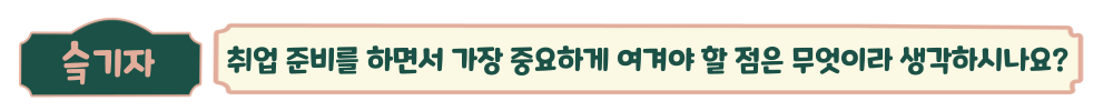 저는 ‘자신감😎’이라고 생각합니다. 인터뷰에서도 계속 반복되듯 단순 스펙 자랑보단 “회사에서 잘 적응하고, 주어진 일을 잘 할 수 있다.”는 자신감을 내비치는 것이 중요하다고 말씀하시는데요. 무작정 스펙만 쌓기보단, 회사도 하나의 작은 사회라는 걸 잊지 않고 사회의 좋은 구성원이 되겠다는 포부를 담는 것도 신선한 취뽀 꿀팁이 되겠네요~ (ノ◕ヮ◕)ノ*:・゚✧