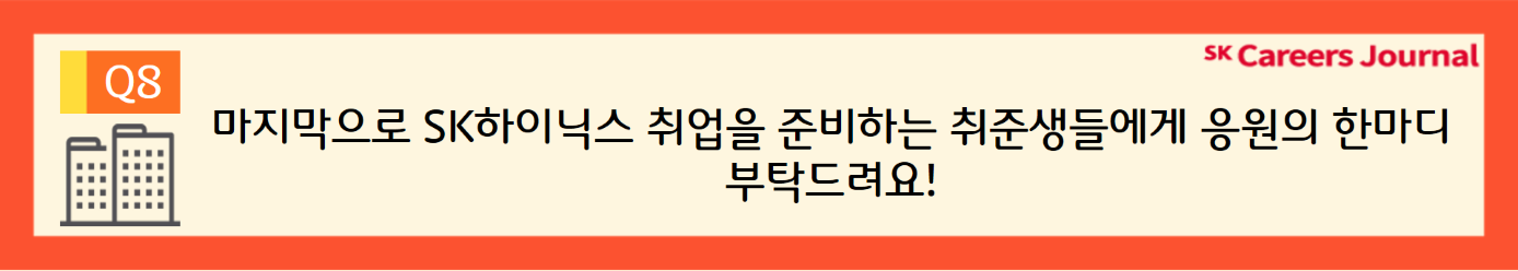 이 인터뷰가 SK하이닉스 취업을 준비하는 많은 취준생분께 좋은 원동력이 되어 긍정적인 영향을 미칠 수 있길 바랍니다! 여러분께 큰 도움이 되었길 바라며 앞으로 전달될 많은 SK하이닉스 취업 소식에도 꾸준한 관심 부탁드립니다.