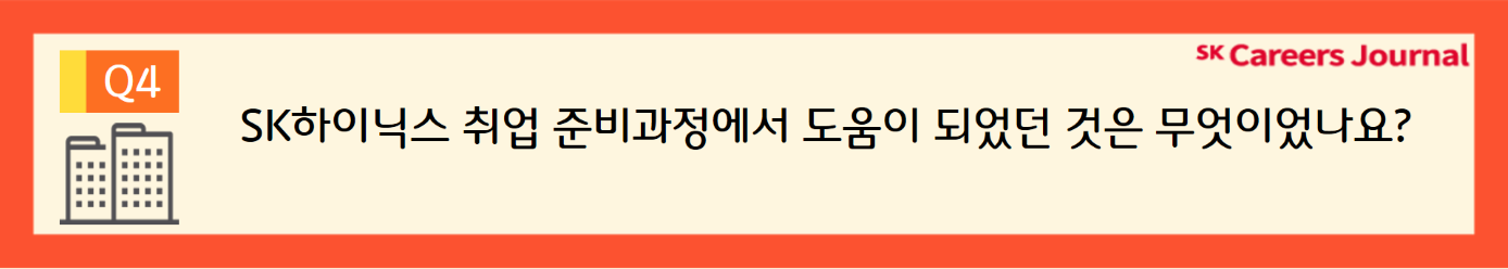 신석모TL님: 학부 재학 중 반도체 관련 과목들을 주로 수강하면서 전공지식을 쌓아왔던 것이 도움이 되었습니다. 나아가, 반도체대전 SEDEX에 참가하여 최신 반도체 기술력과 관련 뉴스들을 들을 수 있었고, 하이닉스에 대해 자세히 알고자 SK하이닉스 뉴스룸 홈페이지를 통해 하이닉스의 기술력과 기업 문화 등을 자세히 알았던 것도 큰 도움이 되었습니다.