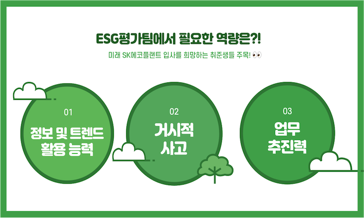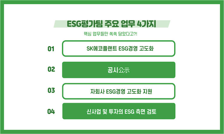 이 외에도 SK에코플랜트가 추진하는 신사업이나 투자 건을 ESG 측면에서 사전 검토하는 업무를 담당하고 있습니다.