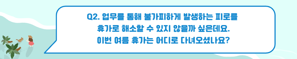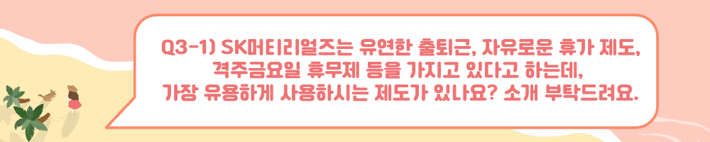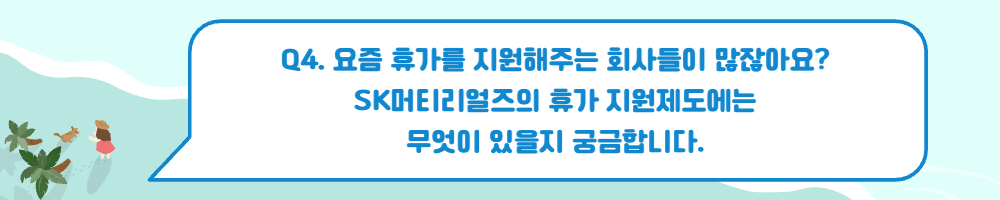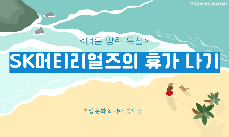 뜨거운 여름을 맞이하여 SK머티리얼즈 사원들은 여름 휴가를 어떻게 보냈을까요? 흥미로운 휴가 후기와 동시에 SK머티리얼즈의 사내 휴가 제도 등의 기업 문화를 소개해드리려고 하는데요! SK머티리얼즈는 refresh 휴가, 휴양지원 등의 휴가 제도 뿐만 아니라 선택적 근로 시간제, 요일 변형 근무제 등을 운영하고 있습니다.