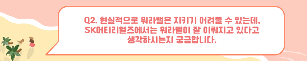 이와 관련된 ‘워라밸’ (work & life balance)이라는 용어를 흔히 접하셨을 것이라고 생각되는데요. ‘워라밸’은 일과 삶의 균형을 의미합니다. 가정(일상)과 직장 사이의 적절한 균형과 조화를 이룬다면, 개인의 만족감을 올림과 동시에 일의 효율성까지 상승시킬 수 있습니다. 이러한 ‘워라밸’에 특히 취업 준비생분들은 많은 관심을 가지실 수 밖에 없을 것 같습니다. 과연 SK머티리얼즈에서 ‘워라밸’을 어떠한 방식으로 추구하고 있는지 궁금하지 않으신가요? SKCE가 생생하게 전달해드립니다!