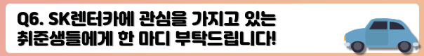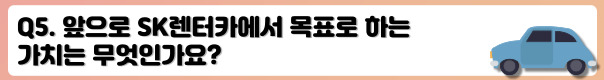 오상열 매니저님: SK렌터카는 모빌리티 서비스 Provider 로서 앞으로의 다양한 모빌리티 관련 Biz Model을 개발해 나갈 것입니다. 따라서 비단 자동차뿐만 아니라 관련된 연관 비즈니스에 관심이 있는 취업 준비생들에게 항상 취업의 기회는 열려 있다고 할 수 있겠습니다.
