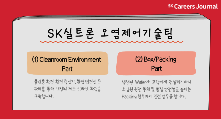 우선 저는 화학공학을 전공했습니다. 오염제어기술팀은 크게 Cleanroom Environment 업무와 Box/Packing 업무로 나누어져 있는데, 저는 Box/Packing 업무에서 생산된 Wafer가 고객에게 전달되기까지 오염원 원천 봉쇄 및 품질 안전성을 높이는 Packing 원부자재 관련 업무를 맡고 있습니다.