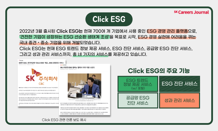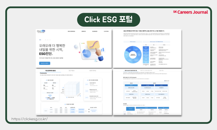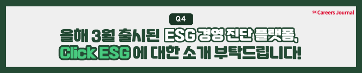 올해 3월에는 ESG 경영 관리 플랫폼인 ‘Click ESG’을 출시하여 국내 중견・중소 기업의 ESG 경영 실현에 솔루션을 제공하고 있다고 합니다!