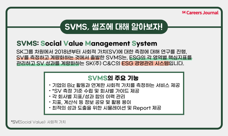 최태원 회장님께서 강조하시는 사회적 가치에 대한 화폐화를 전환할 수 있는 시스템인 SVMS를 SK그룹 공통 서비스로 구축해서 현재 그룹 멤버사분들이 사용하고 있는데요. 저는 SK그룹 공통 서비스인 *SV 측정 시스템(SVMS), 그리고 기업의 ESG 경영을 지원하는 Click ESG 서비스를 운영하고 있습니다.