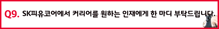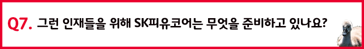 김찬일 매니저님: SKMS에 의거하여 적극적이고, VWBE(자발적, 의욕적 두뇌 활동: Voluntarily / Willingly / Brain Engagement)가 가능하며 어려운 상황을 해결하는 능력을 가진 분을 찾고 있습니다. 그리고 SK피유코어가 고부가 가치 상품을 중심으로 발전하고 있기 때문에, 연구 인력의 경우 전문성을 높게 평가하고 있습니다. 학위 부문, 전문 자격증, 다른 곳에서의 경험 등을 전문성 점검에 참고 사항으로 활용하고 있습니다.