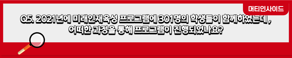 미래인재육성은 지역사회의 아동/청소년을 대상으로 진행하는 활동입니다. 이 활동들은 회사의 Biz.와 연계한 진로체험교육, 지역 기관 및 단체와 연계한 산학연계 인재 육성, 지역 예체능 인재에게 장학금을 지원하는 우수인재 장학금 지원으로 구성되어 있습니다.
