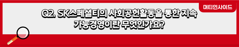 SK스페셜티는 지속가능하고 행복한 사회를 만들기 위해 다양한 사회공헌 활동을 추진하고 있습니다. 이를 통해 지역사회 경제는 물론, 모두가 행복하고 더불어 성장해 나가는 사회 조성에 기여하고 있습니다. 앞으로도 경제적 성과와 함께 창출한 사회적 가치가 다시 회사 발전의 기반이 된다는 선순환 구조에 대한 믿음을 가지고 지역사회와 행복을 나누며 함께 성장하고자 합니다.