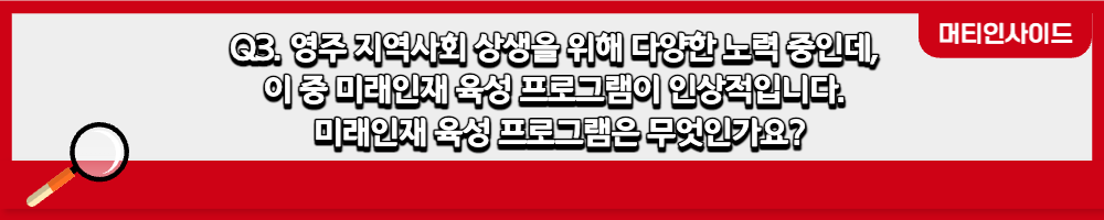 3) 우수인재 장학금 지원의 경우 관내에 예체능에 우수한 자질을 가지고 있는 학생들을 대상으로 장학금을 후원하고 있습니다. 영주 지역은 타 도시 대비 예체능 분야의 Infra가 상대적으로 미비하여 축구, 싸이클, 음악밴드, 오케스트라 연주 등에 관심이 있는 학생들에게 조금이나마 도움을 주기 위하여 후원을 시작하였습니다. 그 중 축구, 싸이클 분야의 학생들은 각종 대회에서 두각을 나타내고 자신의 미래의 꿈을 위해 열심히 달려 나가고 있습니다.