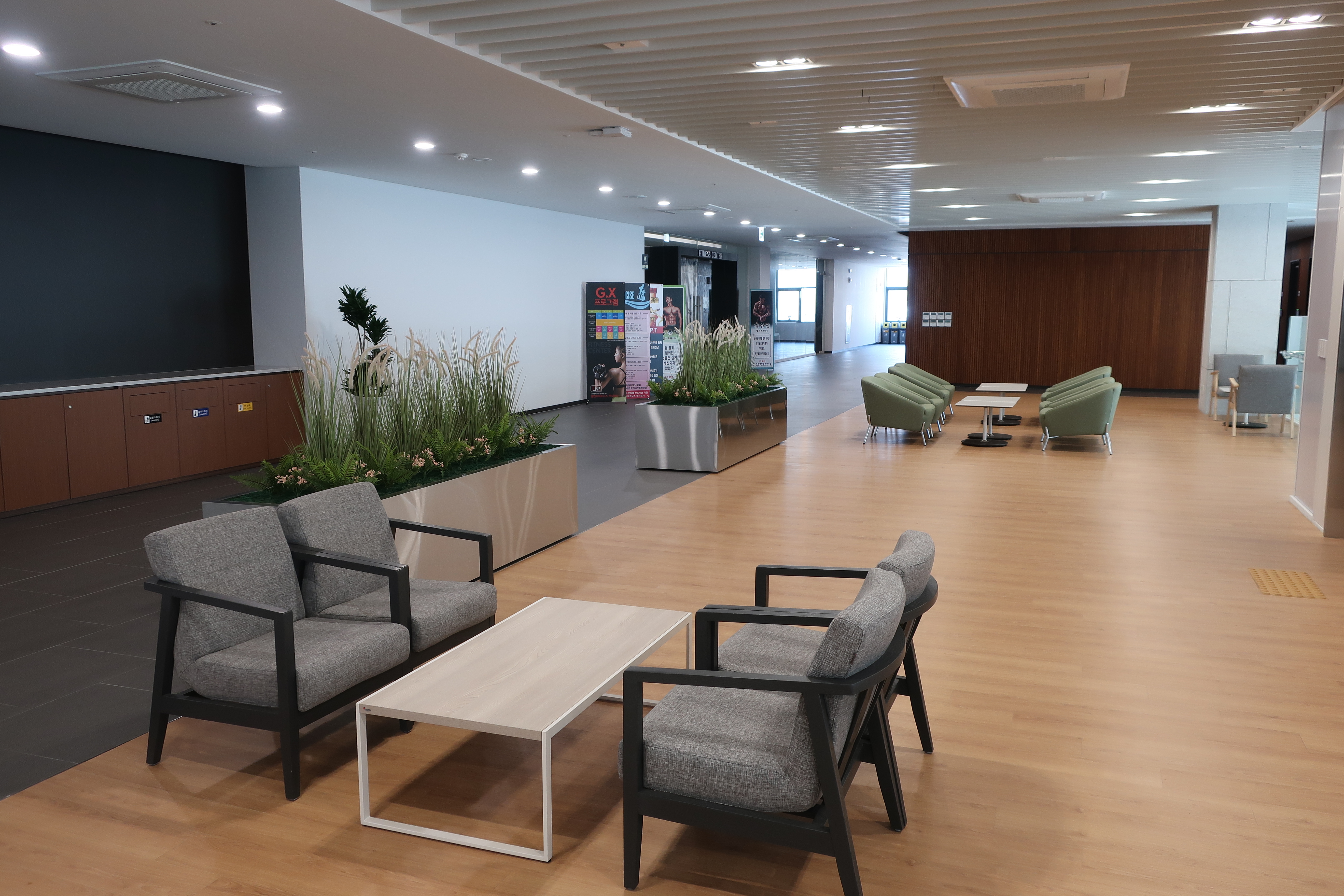 다음으로 가볼 공간은 바로 강당입니다! 이곳은 SK실트론에서 인턴십 프로그램을 진행하거나 각종 세미나, 오리엔테이션 등 외부 손님을 응대할 때 주로 활용하는 공간인데요, 필라테스와 같은 GX 또한 강당 내 공간을 활용하여 진행됩니다😊