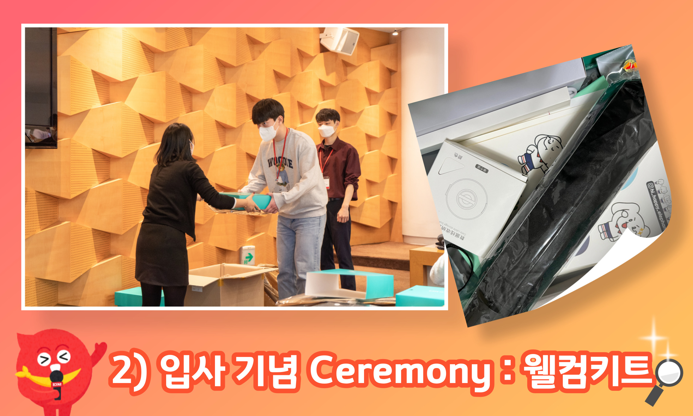 재밌었던 회사소개 퀴즈 타임이 끝나고, 본격적으로 입사 기념 Ceremony 시간이 있었습니다. 신입사원분들에게 웰컴키트를 증정했는데요, 각 회사의 로고가 각인된 텀블러, 우산, 볼펜과 더불어 업무할 때 유용하게 활용할 수 있는 노트북 거치대, 무선 충전 마우스패드, 이 외에도 친환경 마가방과 각종 스티커 등등 애사심이 뿜뿜할 수 밖에 없는 알찬 구성에 감탄했던 것 같습니다!!👏