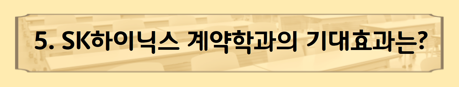SK하이닉스는 반도체계약학과 운영을 통해 반도체 전문인력 풀을 늘리고, 우수한 인재들을 반도체 산업으로 유입시키는 역할을 해주길 기대하고 있습니다. 더 나아가 청년실업 문제를 해결하고, 이렇게 양성된 인재들이 반도체 기술 강화에 이바지해 국가 경쟁력을 끌어올리는 미래를 그리고 있다고 합니다. 나아가 SKMS를 토대로 한 SK하이닉스의 조직문화에 자연스럽게 녹아들 수 있는 인재를 양성함으로써 기업의 성장을 넘어 사회를 더욱 행복하고 따뜻하게 만드는 미래까지 그리고 있습니다.