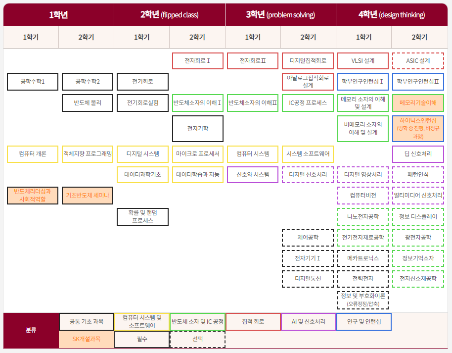 반도체 계약학과는 반도체 산업 특화 커리큘럼이 강점입니다. SK하이닉스 계약학과의 시작을 연 고려대학교 반도체공학과 커리큘럼을 살펴보면 반도체리더십과 사회적역할, 기초반도체 세미나, 메모리기술이해 등 SK에서 직접 개설한 과목이 학부생 과정에 포함되어 있는 것을 확인할 수 있습니다. 그뿐만 아니라 4학년 2학기에는 SK하이닉스에서 직접 인턴십을 해볼 기회도 주어집니다. 전기전자공학의 기초 교과와 더불어 반도체공학과만의 특화교과목이 함께 구성되어 있다는 것을 확인할 수 있습니다. 이러한 커리큘럼을 보면 학부 과정만으로도 실무에서 활약할 수 있는 전문성을 확보할 수 있다는 것을 보여줍니다.