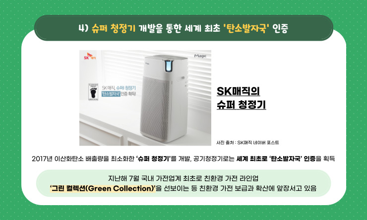 SK매직은 지난 2017년, 이산화탄소 배출량을 최소화한 ‘슈퍼 청정기’를 개발해 공기청정기로는 세계 최초로 ‘탄소발자국’ 인증을 획득했습니다. 이에 멈추지 않고 지난해 7월 국내 가전업계 최초로 친환경 가전 라인업 ‘그린 컬렉션(Green Collection)’을 선보이는 등 친환경 가전 보급과 확산에 앞장서고 있습니다. 그린 컬렉션 제품은 친환경 플라스틱 소재를 적용한 친환경 제품을 말합니다. 그린 컬렉션 제품은 렌털 계약이 종료된 후에도 제품을 폐기 처분하지 않고 100% 재활용해 신제품 생산에 적용하는 프로세스도 구축하기까지 했답니다.