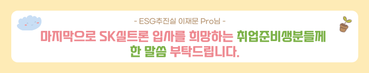 국내 ESG 분야의 가장 선도적인 위치에 있는 SK에서 더 공부하고 익혀서 전문성을 높이고자 하는 마음으로 ESG추진실에 들어오게 되었습니다. SK실트론의 ESG추진실은 ESG 경영을 선제적으로 고도화하고 실행하여 지속 가능한 기업가치 제고를 위해 끊임없는 노력을 하고 있습니다.