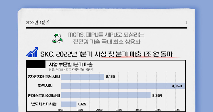 2022년 1분기의 두 번째 소식입니다. SKC의 1분기 매출이 1조 1,206억 원, 영업이익 1,330억 원을 달성하며 역대 최고 분기 매출을 달성하였습니다. 이는 전년 동기와 비교하면 매출은 50.5%, 영업이익은 57.6% 증가한 성과입니다. 게다가, 모든 사업 부문에서 성장세를 보였다는 점이 고무적입니다. 자세한 내용은 1분기 요약 이미지와 SKC IR 자료실을 참고해 주세요.