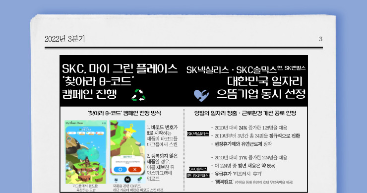 안녕하세요, SKC 소식을 전하는 SK Career Editor 김수빈입니다. 2022년은 드디어 포스트 코로나를 향해 나아갔지만, 불안한 국제 정세와 높은 금리로 경제 회복이 둔화된 한 해였습니다. 한편, 이런 어려움을 극복하고, 2022년 한 해 동안 SKC가 어떤 성과를 거두었는지 정리하였습니다. 지금부터 저와 함께 톺아보시면서 SKC의 활약상을 살펴볼까요?