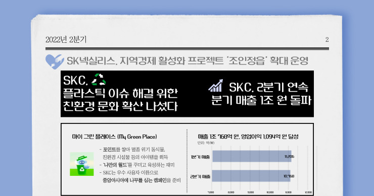 2022년 2분기의 세 번째 소식입니다. SKC의 2분기 매출이 1조 768억 원, 영업이익 1,094억 원을 달성했습니다. 1분기에 이어 2분기에도, SKC의 분기 매출은 1조 원을 돌파하였습니다. 전 세계적인 공급망 불안정과 경기 불안정에도, 2차전지용 동박사업의 영업이익이 전년 대비 57.4% 증가하며 SKC의 큰 성장을 증명했습니다. 자세한 내용은 SKC IR 자료실을 참고해 주세요. 더불어, 글로벌 ESG 평가지표인 MSCI(Morgan Stanley Capital International)의 ESG 평가등급은 전년도 ‘BB’에서 올해 ‘BBB’로 상향되었답니다.