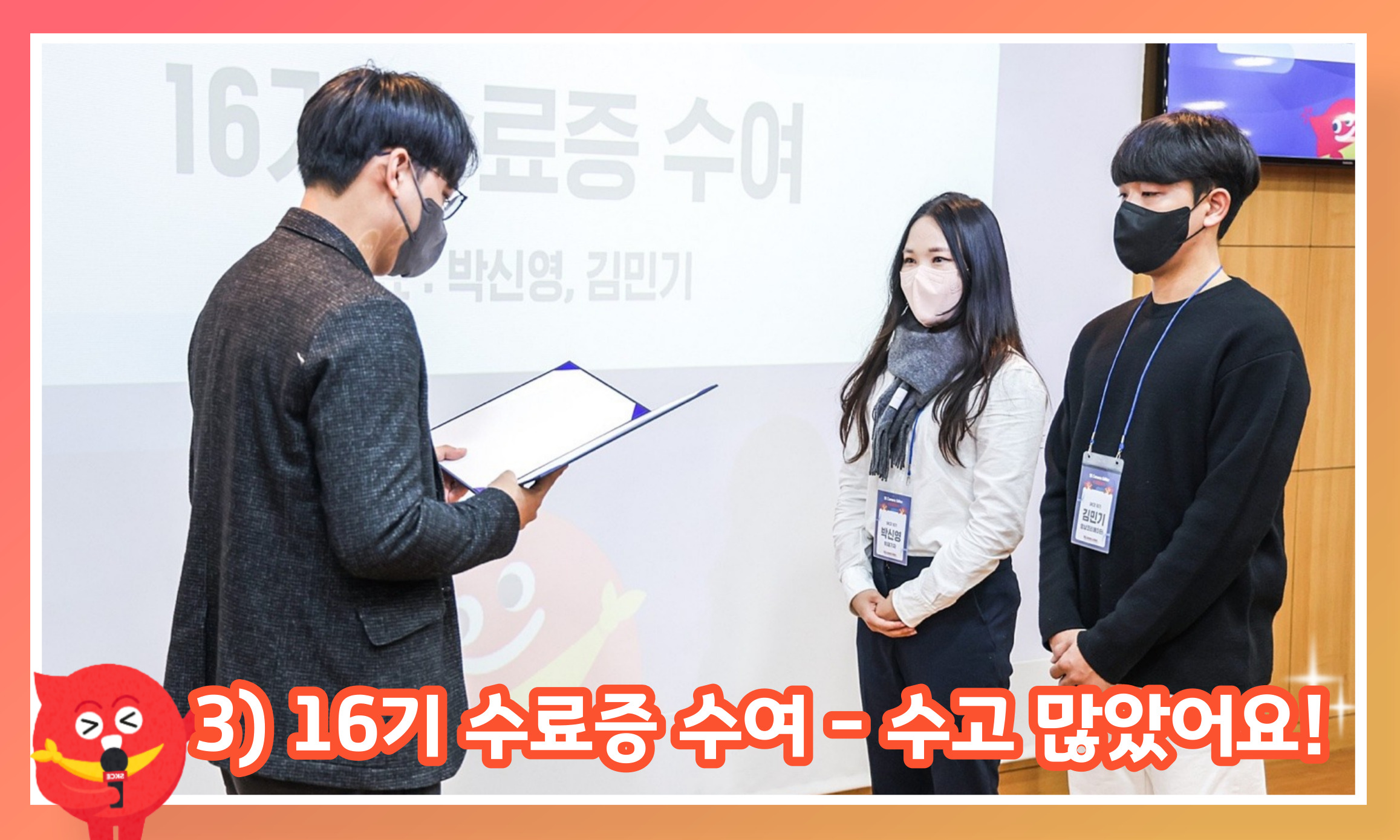 다음은 16기 수료증을 수여하는 시간을 가졌는데요,