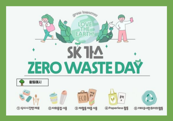 그 노력을 보여주는 또 다른 발걸음입니다! 9월 7일이 ‘푸른 하늘의 날’이라는 것, 알고 계셨나요? SK가스는 올해 푸른 하늘의 날을 맞아 제로 웨이스트 캠페인을 진행했습니다. 위 캠페인은 대기환경의 중요성을 알리고 기후변화에 대한 이해를 높이기 위해 기획된 캠페인인데요, SK가스 구성원들이 하루 동안 쓰레기를 줄이기 위한 다양한 활동에 참여했습니다. 사내 카페에서는 개인 텀블러를 사용해 음료를 구입하고, 구내식당에서는 잔반제로를 실천하였으며, 페이퍼리스 활동과 재활용 제품 사용에도 참여하였습니다. SK가스의 비전인 Net Zero Solution Provider로 거듭나기 위해 구성원의 일상생활에서부터 환경 보호 활동에 앞장서고, ESG 경영과 신기업가정신을 몸소 실천하는 모습입니다.