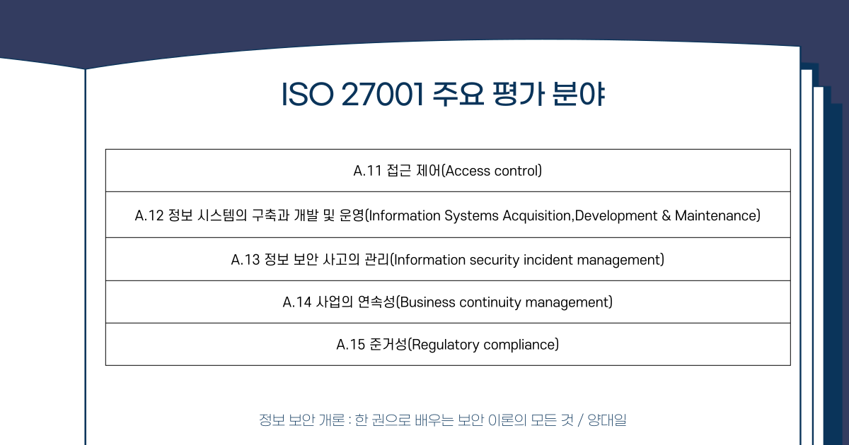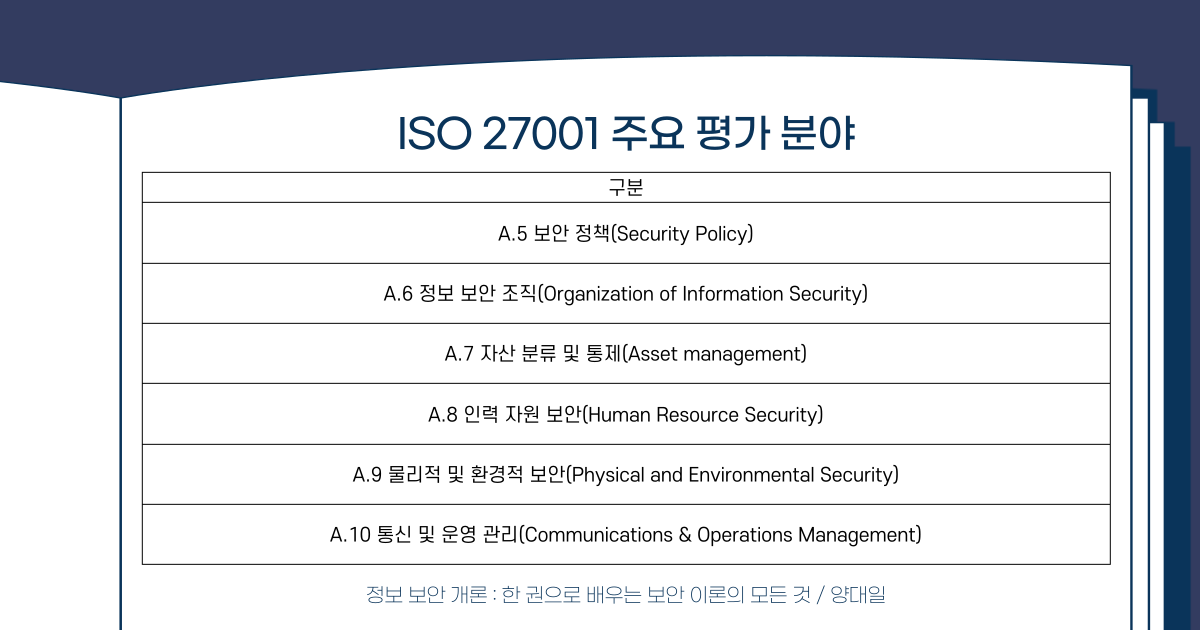 IS0 270001 인증을 위한 평가 분야를 알아볼까요? 더 구체적인 사항은 홈페이지를 참고해 주시고, 간략한 기준에 대해서 알아보겠습니다. 보안정책, 정보 보안 조직, 자산 분류 및 통제, 인력 자원 보안, 물리적 및 환경적 보안, 통신 및 운영 관리, 접근 제어, 정보 시스템의 구축과 개발 및 운영, 정보 보안 사고의 관리, 사업의 연속성, 준거성 등의 기준이 존재합니다. 체계적이고 다양한 부문을 검토하는 모습을 알 수 있는 만큼 기업이 해당 인증을 받기 위해서는 많은 노력이 필요하다는 것을 알 수 있습니다.