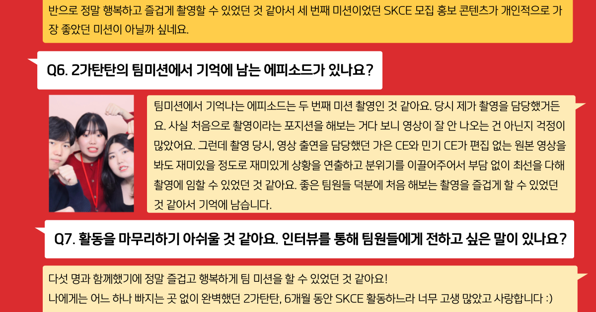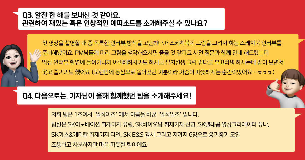 특히, SKCE 활동 중 팀미션을 통해서 깊은 우정과 뜻깊은 추억을 많이 만들 수 있었습니다. 그래서 이번 기사를 통해 2022년을 함께 돌아보며 SKCE 활동을 마무리해보고자 합니다. 1팀의 김민기 영상 크리에이터님, 2팀의 박수현 취재 기자님을 인터뷰의 주인공으로 모셨습니다. 그리고 3팀의 제가 인터뷰이가 되어보았으니 끝까지 함께 해주세요😊
