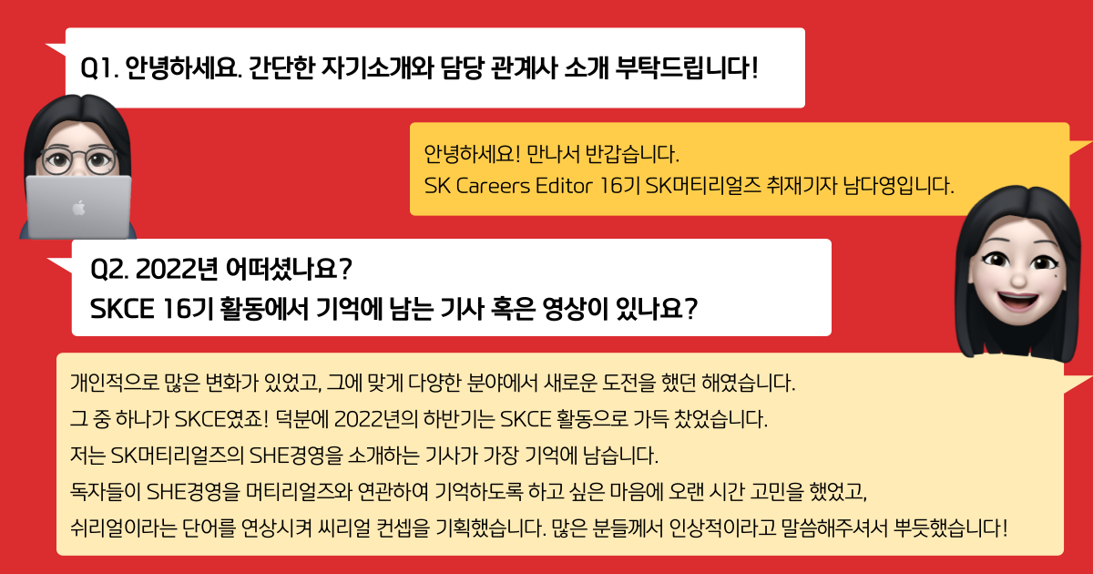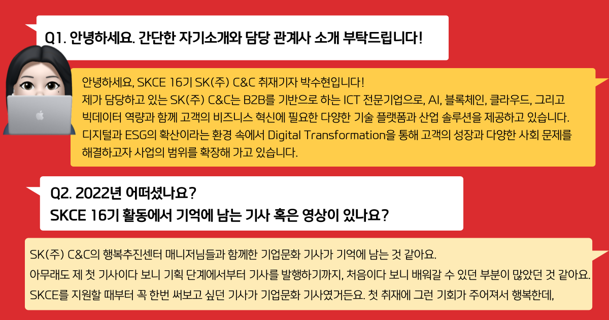 2022년 올 한 해 어떠셨나요? SKCE에서 취재 기자로 활동하는 동안 많은 것들을 배울 수 있었습니다. 콘텐츠 기획력, 인터뷰를 위한 소통 능력, 추진력, 협동심, 배려심 등 다양한 능력과 마음을 쌓을 수 있었습니다. 이러한 과정을 함께 해준 SKCE 16기 취재 기자, 영상 크리에이터분들께 고마운 마음을 전하고 싶습니다.