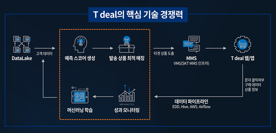 T deal은 SK텔레콤 고객 전용의 AI 큐레이션 커머스예요. SK텔레콤 고객분들에 대한 데이터 분석을 토대로 각 고객분께 적합한 추천상품 정보를 문자로 보내드리고, 고객들은 문자의 링크를 클릭하면 별도의 회원가입 없이 간편하게 구매를 할 수 있는 문자 쇼핑 서비스입니다.