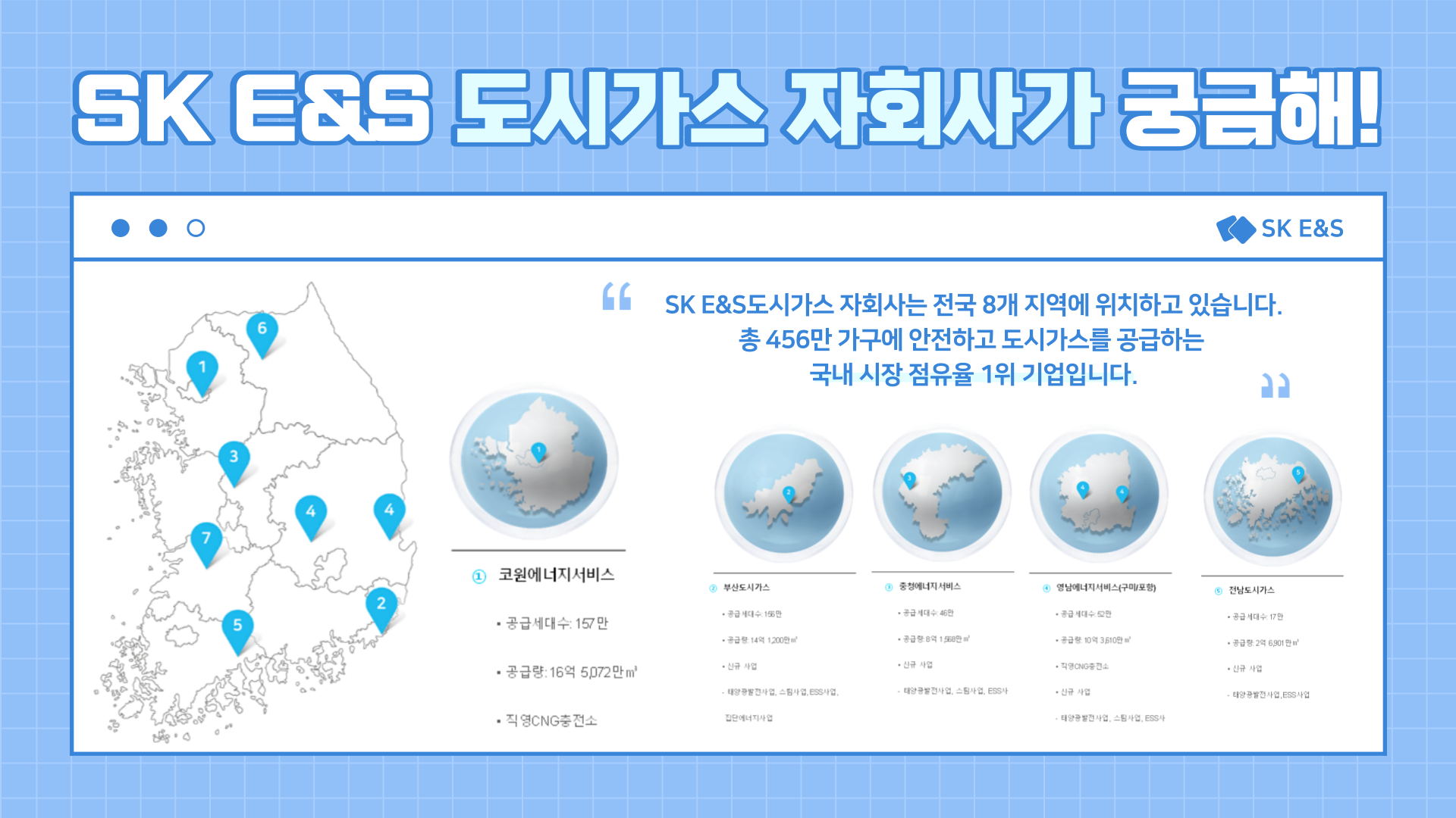 SK E&S 도시가스 자회사는 총 456만 가구에 안전하고 깨끗한 도시가스를 공급하는 국내 시장 점유율 1위 기업입니다😉