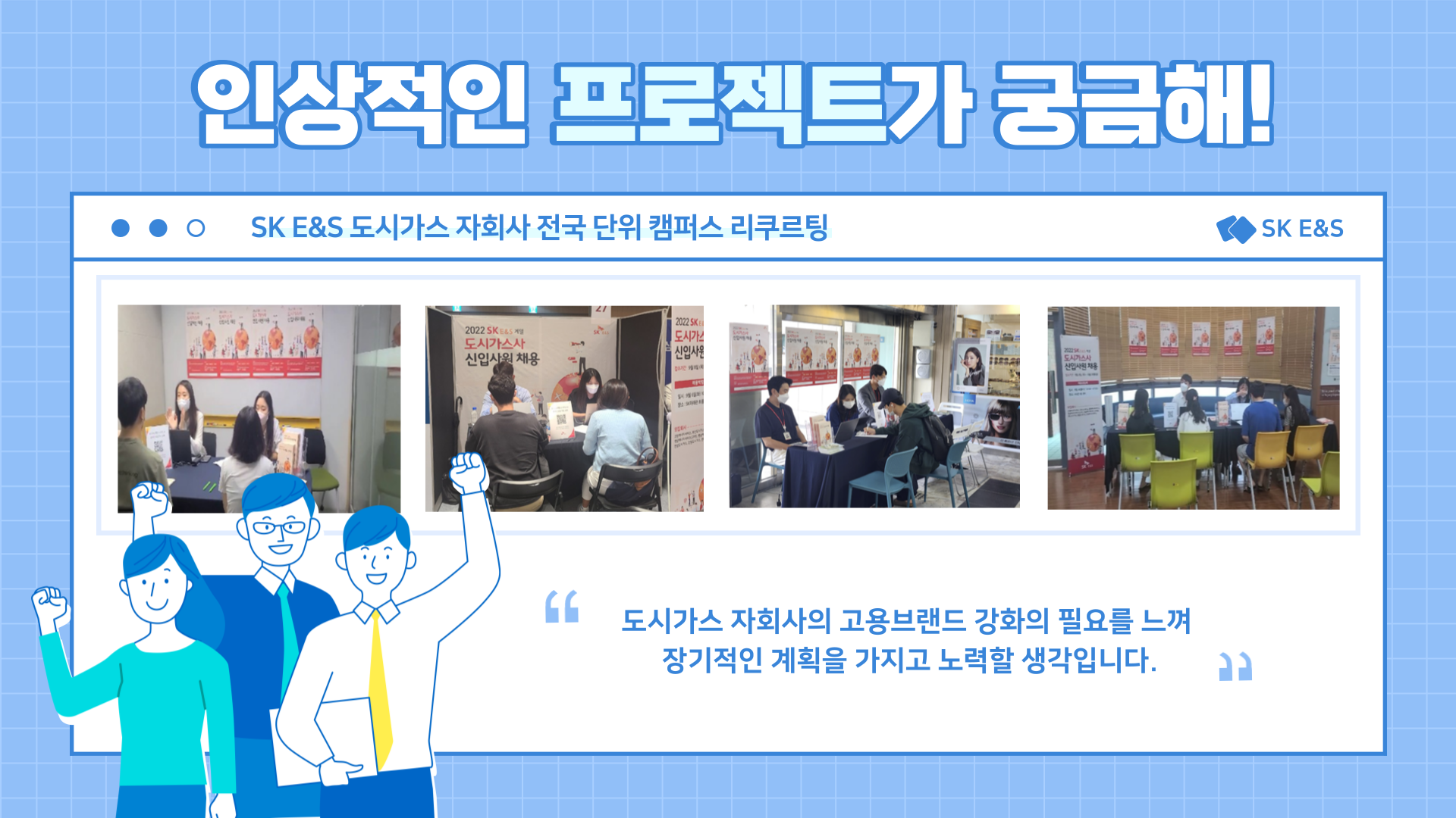 이는 채용박람회/ 채용 상담 부스 운영을 통해 도시가스사에 대한 홍보를 진행하고 취업준비생들의 고민을 마주하고자 노력한 프로젝트입니다😮 코로나로 인하여 직접 만나지 못했던 취업준비생들의 생각을 듣고 나니, 채용 기획 담당자로서 책임감을 더욱 느끼셨다고 해요.