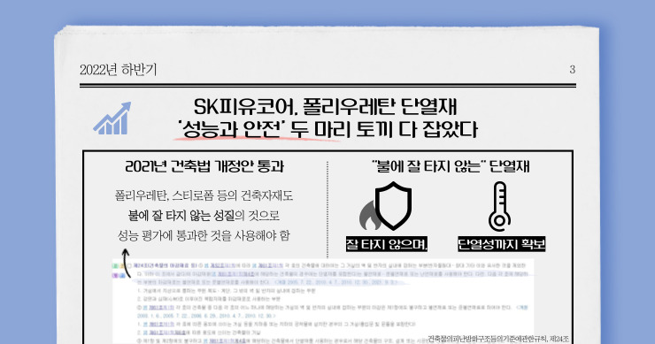 2021년, 국회 본회의는 가연성 건축자재 사용을 전면 금지하는 건축법 일부개정안을 통과시켰습니다. 잇따른 화재 사고 후, 가연성 건축자재로 인한 인명 피해를 방지하기 위해서였는데요. 개정안에 따르면, 폴리우레탄, 스티로폼 등으로 만든 건축자재도 준불연(불연: 불에 타지 아니함; 준불연재료 - 불연재료에 준하는 성질을 가진 재료로서 국토교통부령으로 정하는 기준에 적합한 재료) 성능을 갖추어야 합니다. 그런데 2022년 12월 19일, SKC Family의 일원인 SK피유코어가 폴리우레탄 단열 소재의 화재 안전성을 한국건설생활환경시험 연구원으로부터 공식 인정받았다고 밝혔습니다. 이는 업계 최초로 폴리우레탄 단열 소재의 화재 안전성을 공식적으로 인정받은 사례인데요. SK피유코어는 건축자재 전문기업 4개 기업과 2022년 10월부터 컨소시엄을 구성하여, 준불연재료 적합 시험에 통과한 단열재 제품을 개발하였다고 공개하였습니다. 기존 폴리우레탄 단열재의 단열성을 유지하면서, 동시에 잘 타지 않는 성질까지 확보했다는 점이 주목할 지점입니다. SK피유코어는 향후 단열재 제조사들과 함께 안전한 폴리우레탄 단열재 양산 기술 및 전용 설비 개발에도 힘쓸 예정이라고 해요. 우리 생활의 편리함과 안전성, 두 마리 토끼를 1등으로 잡아낸 SK피유코어의 2023년이 기대됩니다.