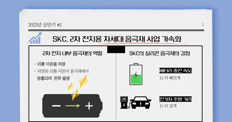 2차 전지 성능을 향상시키려면 어떤 것이 필요할까요? 많은 것들이 있겠지만, 그중 성능을 대폭 개선할 수 있는 차세대 소재가 있는데요. 바로 이 차세대 소재 확보에 SKC가 적극적으로 움직이고 있습니다. 차세대 소재의 정체는 바로 실리콘 음극재입니다. SKC는 실리콘 음극재 사업권을 확보하여, 해당 소재의 양산을 담당할 사업운영회사를 설립하고 2024년 양산 개시를 목표로 하고 있습니다.