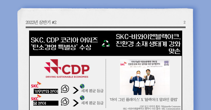 1월 26일, SKC가 ‘2021 CDP Korea Awards’에서 “탄소경영 특별상”을 수상했습니다. ‘2021 CDP Korea Awards’는 글로벌 ESG 이니셔티브 CDP(Carbon Disclosure Project)의 한국위원회 주관으로 개최되었는데요. CDP는 글로벌 비영리기관으로, 전 세계 주요 상장 기업들의 환경과 관련한 정보를 분석해 매년 보고서를 발행하고 있습니다. 해당 보고서는 글로벌 금융기관들이 투자를 결정할 때 참고하는 주요 ESG 지표로 활용될 정도로 영향력이 크답니다. 2021년, SKC는 CDP 평가에 처음으로 참여했는데요. 처음으로 평가받은 참여사임에도, 기후변화와 물 분야에서 각각 전 세계 평균보다 높은 등급을 받으며 그 노력을 인정받았습니다. 행동으로 실천하는 ESG를 보여주고 있는 SKC의 노력에 앞으로도 많은 관심 부탁드립니다!