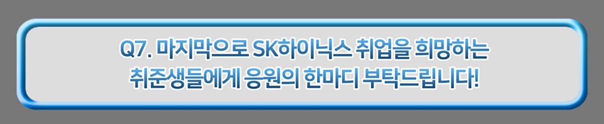 박상원 TL님: SK하이닉스에 합격한 후 동기들끼리 모였을 때 공통적으로 나왔던 얘기가 ‘어떻게 내가 과정마다 합격해서 여기까지 올 수 있었는지 신기하다’는 것이었습니다. 저도 제가 SKCT에서 진작에 떨어질 것이라고 생각했지만, 어느새 여기까지 와서 현업 교육을 받고 있네요. 저는 결코 지능이 높은 사람도, 소위 일컫는 굉장한 스펙을 가진 사람도 아닙니다. 여러분이 얼마나 이 회사에 오고 싶고, 그를 위해 얼마나 노력하고 공부했는지, 패기 있고 자신감 있게 보여주세요. 떨어질 거라고 스스로 예단하지 마시고, 벌써 겁먹지 마세요. 할 수 있습니다. 여러분 모두 훌륭한 역량을 바탕으로 유능한 인재로 성장할 수 있는 무한한 잠재력을 가진 분들입니다. 이번 시즌에 준비 잘 마치셔서 나중에 회사에서 같이 커피 한잔하면 좋겠네요. 여러분의 앞날을 진심으로 응원하겠습니다. 감사합니다.