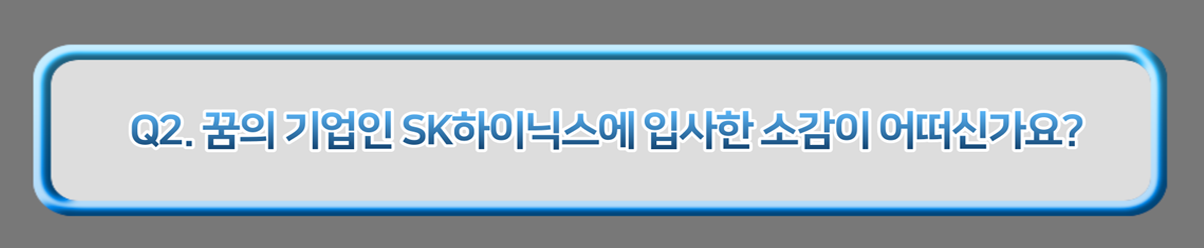 조수인 TL님: 저는 하이닉스가 절 선택한 것이 아니라, 제가 하이닉스를 선택했다고 생각합니다. 여러 반도체 기업 중에서도 SK하이닉스는 젊은 세대들에게 열려있는 기업 문화를 가지고 있고, 이러한 특징이 제 활발하고 당돌한 성격과 잘 맞는다고 생각했어요. 또 같은 반도체 회사더라도 직무에 따라 하게 되는 일이 많이 다른데, 소자 분야라면 제가 석사나 학부 연구생 때 했던 연구와 업무를 그대로 이어받아 경험을 살리기에 적합하다고 생각해서 선택하였습니다.