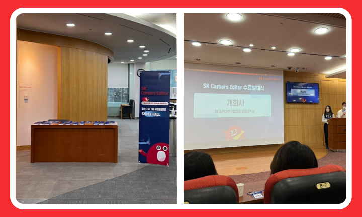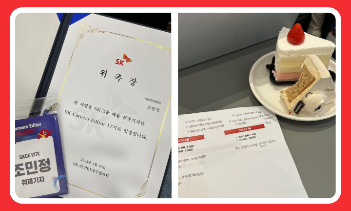 본론으로 들어가기 앞서 아직 ‘SK 커리어스 에디터’가 생소한 분들을 위해 짧고 간단한 소개를 준비해 보았는데요, SKCE로 줄여서 부르기도 하는 SK 커리어스 에디터’는 도대체 누구인가! SKCE는 SK그룹 채용 소식 및 주요 관계사의 소식을 전하는 기자단입니다. SK그룹 채용에 관심이 있거나 콘텐츠 제작에 흥미를 느끼는 대학생이 모여있는 기자단으로, 모집 시 취재 기자와 영상 크리에이터 중 하나의 부문을 선택하여 지원하고 선발되는 과정을 거칩니다. SKCE는 채용 소식을 전하는 것 외에도 매월 진행되는 정기 기획 회의에 참석하여 서로의 아이디어와 피드백을 공유하고, 각 관계사의 멘토님과 만날 수 있는 기회를 갖게 됩니다. 희망하는 주제로 기사와 영상도 만들어보고, 다른 CE들과 끈끈한 친구가 될 수 있고, SK그룹 관계사 임직원과의 만남이라는 다양한 기회와 혜택이 준비되어 있습니다. 그리고 SKCE 활동 수료자에 한해 SK그룹 신입/인턴 채용 지원 시 첫 전형 면제라는 엄청난 기회까지! 예비 CE분들도 이런 좋은 기회에 함께하길 바라는 마음으로 응원합니다😊