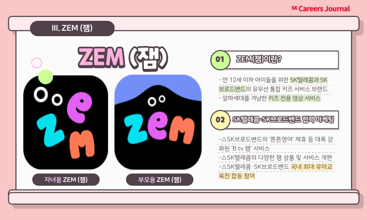 ZEM은 만 12세 이하 아이들을 위한 SK텔레콤과 SK브로드밴드의 유무선 통합 키즈 서비스 브랜드로, 알파세대를 겨냥한 키즈 전용 영상 서비스입니다. 두 관계사 간 협력을 통해 한층 높은 고객 지향적 학습 방식과 콘텐츠를 제공함으로써 ZEM을 부모와 아이에게 사랑받는 서비스로 자리매김하겠다는 목표를 가지고 임한 것이죠. 이번 마케팅을 통해 △SK브로드밴드의 ‘튼튼영어’ 제휴 등 대폭 강화된 ‘B tv 잼’ 서비스 △SK텔레콤의 다양한 잼 상품 및 서비스 개편 △SK텔레콤·SK브로드밴드 국내 최대 유아교육전 합동 참여 △11월 T-day 프로모션 등을 실시할 계획이라고 합니다!