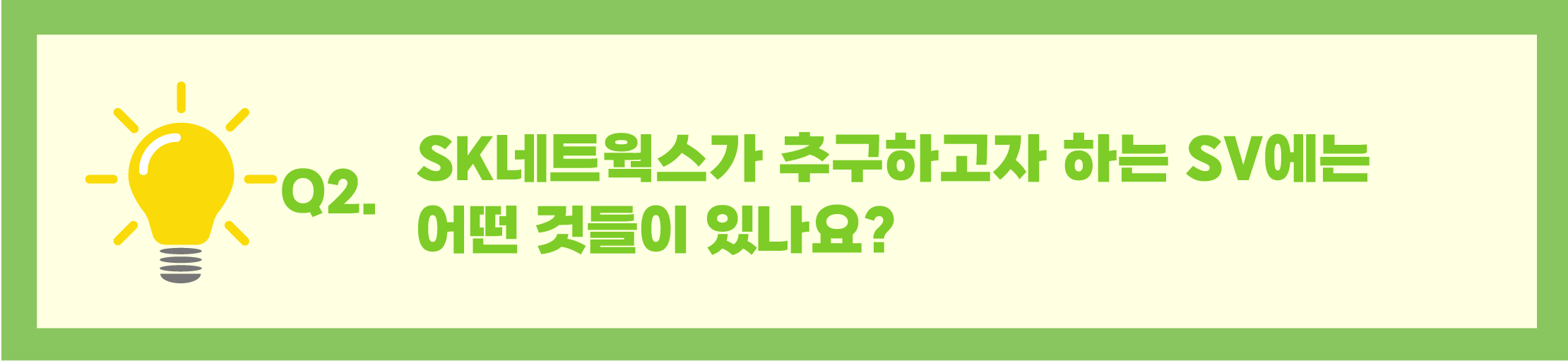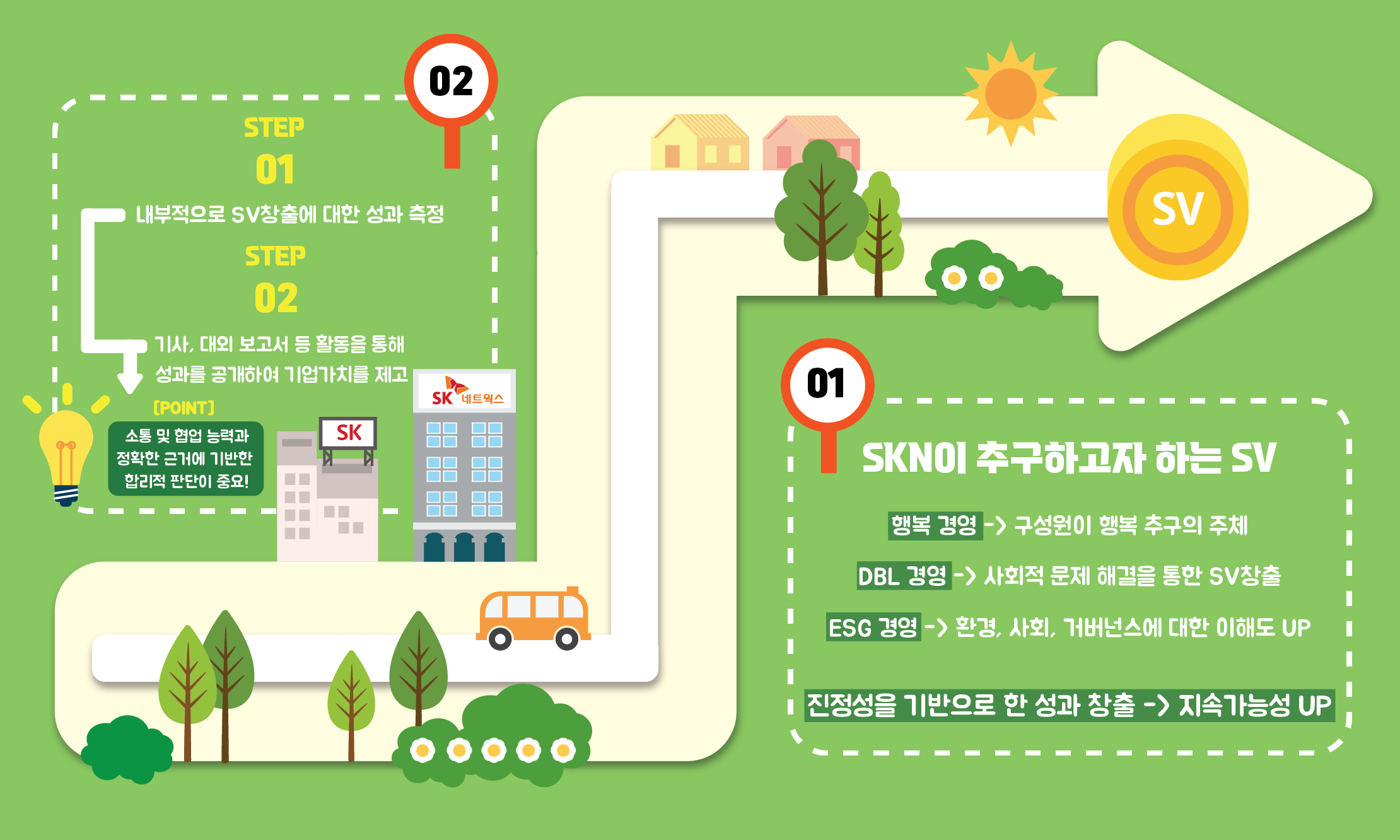 SV는 SK의 경영 원칙에서도 쉽게 찾아볼 수 있는데요, 경제적 가치(EV, Economic Value)와 더불어 가장 중요한 가치 중 하나이며 기업의 지속적인 성장을 위한 필수 불가결한 요소로 자리잡고 있습니다.