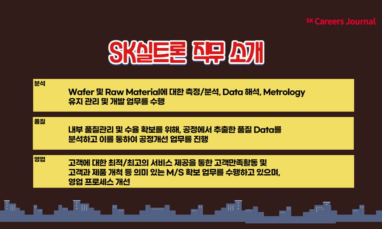 우선 SK실트론에 어떠한 직종이 있는지 여러분들께 간략하게 소개할 필요가 있다고 생각해요!