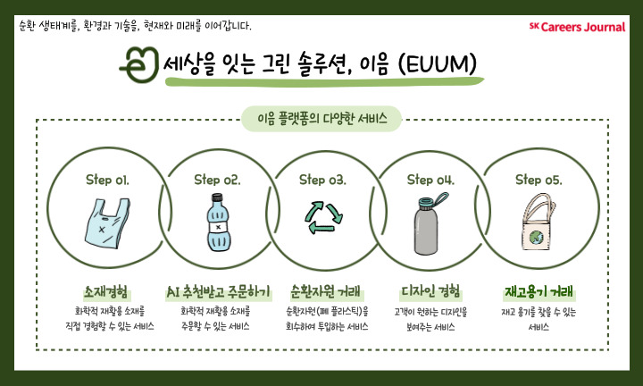 특히 SK케미칼에서는 이음(EUUM)이란 플랫폼을 통해 플라스틱 소재의 생산부터 재활용까지 선순환 생태계를 구축할 수 있다는 사실, 알고 계셨나요? 지금부터 이음 플랫폼에 대해 자세히 알아보겠습니다!