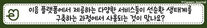 지금까지 김민석 매니저님과 함께 이음 플랫폼에 대해 알아보았습니다. 플라스틱을 막연하게 줄여야 한다고만 생각했는데, 올바르게 쓰고 잘 회수한다면 재활용 생태계를 구축하여 환경을 지킬 수 있다는 점이 매우 인상깊었습니다! 이음 플랫폼으로 선순환 생태계를 구축한다면 함께 성장하고 환경까지 지키는 사회적 가치가 실현될 것입니다. SK케미칼의 지속 가능 경영을 위한 앞으로의 행보에 많은 기대 부탁드립니다!