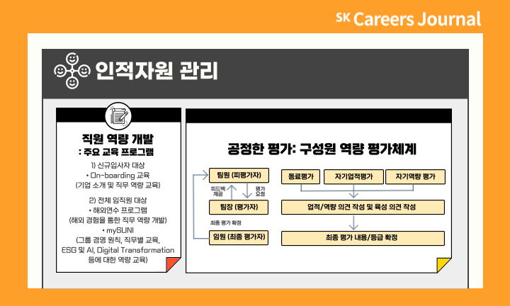 신입 채용을 위한 프로세스뿐만 아니라 기존 SK바이오팜 구성원들의 경력 개발을 위해 SK 그룹 교육 플랫폼인 ‘mySUNI’를 통해 재무, 회계, 마케팅, ESG 등 필수 교육뿐만 아니라 인공지능, 디지털 전환, 글로벌 역량, 리더십, 사회적 가치 등 다양한 분야에 대한 학습을 지원하고 있습니다. 또한 해외 연수를 포함한 맞춤형 교육 프로그램을 지원하고 있습니다. 새롭게 채용된 신규 입사자를 대상으로는 자체 교육 및 멘토링 프로그램을 운영하여 회사 적응을 지원하고 있습니다.