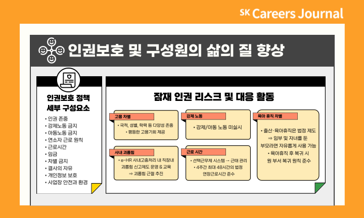 앞선 내용은 SK바이오팜이 구성원의 역량 개발과 행복 증진을 위해 수립한 프로세스였다면, 지금부터는 SK바이오팜이 구성원의 인권보호와 삶의 질 향상을 위해 노력하고 있는 정책과 프로세스에 대해 소개해 드리겠습니다.