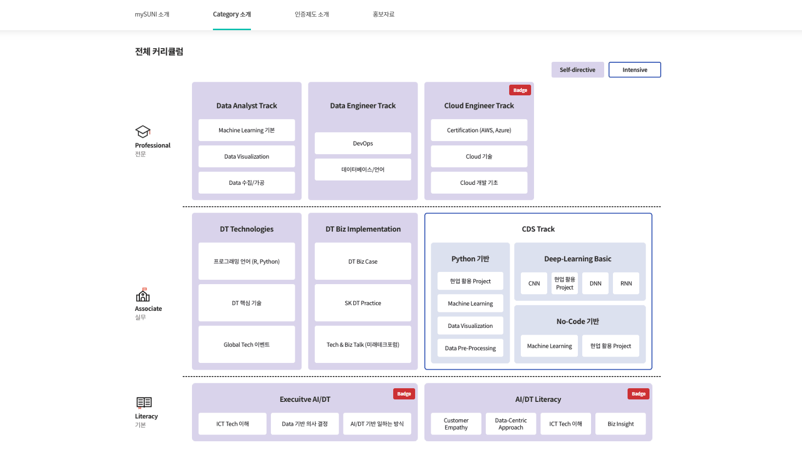 각 카테고리별로 커리큘럼맵이 제안되어 있어, 이것을 참고하여 학습자가 스스로 학습 경로를 디자인하며 자유롭게 학습할 수 있습니다. 체계적인 학습으로 특정 영역에 대한 지식을 깊이 있게 쌓을 수 있는 Badge 인증제도도 있고, Machine Learning과 Demographic 정보를 기반으로 개인화된 Contents Curation도 해 줍니다.
