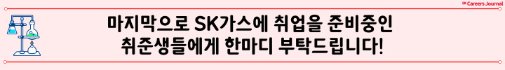 SK가스의 김태협 매니저님과 함께 R&BD직무와 청록수소, 그린 수소를 기반으로 한 탄소중립 신에너지 사업까지 알아보았습니다. 대학원으로 갈수록 연구분야가 좁고 깊어지는 만큼 연구개발 직무에 지원할 때 많은 고민들을 하실텐데요. 매니저님 말씀처럼 연구 활동 중 문제를 직면했을 때 어떠한 공학적 지식들로 해결해 나갔는지, 발생할 수 있는 다른 문제들은 없는지 확인하고 생각했던 경험들이 중요한 것 같습니다! SK가스만의 유일무이한 R&BD직무! 너무 매력적이지 않나요?! 앞으로도 SK가스는 탄소중립을 위해 시장을 선도하는 다양한 사업들을 추진할 예정이니, 취준생분들의 많은 관심과 지원 부탁드립니다☺