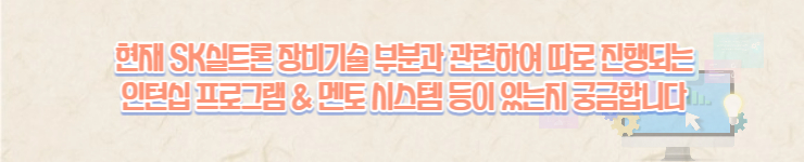 우선 SK실트론 인턴십의 경우에는 작년에 대학생분들을 상대로 인턴십 프로그램을 진행하여 한 달 정도 저희 회사를 방문할 수 있는 기회를 제공하였어요. 그 중에서 절반에 달하는 분들이 채용되어 신입사원 교육을 받았어요. 멘토링 시스템의 경우에도 신입사원에 큰 도움이 되도록 선후배 간에 적응을 돕도록 운영하고 있어서 저 또한 도움을 받이 받았던 기억이 있어요