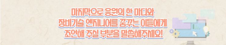 특정 과에 국한되지 않고 기본 역량만 갖춘다면 자신의 능력에 맞는 역량을 풀어나가 녹여내는 점이 중요하다고 생각해요 공정 기술 엔지니어분과 장비 기술 엔지니어 분들의 말씀을 듣다 보면 자신의 한계를 정하기 보다는 장점을 살려서 회사가 자신을 필요로 하는 이유를 보여주는 점이 상당히 중요하고 핵심적이라는 생각을 많이 하였어요. 모든 분들이 자신의 장점과 특성을 깨우치고 보다 효율적으로 준비하셨으면 좋겠어요 다음 시간에는 직무 소개는 잠시 쉬고 행복 채움이라는 마음 따뜻해지는 주제로 소개 돌아오겠습니다. 🙂