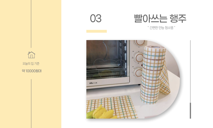 여러분! 주방에서 행주 사용하시나요? 행주는 음식물이 묻다 보니 자주 빨거나 삶아주어야 하는데요, 저는 삶지 않고 뜯어 쓴답니다! 빨아쓰는 행주는 얇은 부직포 원단으로 만들어진 행주에요. 보통 4-5회 정도 사용 후 버리면 깔끔하게 처리 가능한데요, 잘 찢어지지도 않고 흡수력도 좋지만 그 중 가장 편리한 이유는 사용 후 일반쓰레기와 함께 배출이 가능하다는 점이에요! 위생상 깔끔하게 행주를 사용할 수 있답니다.