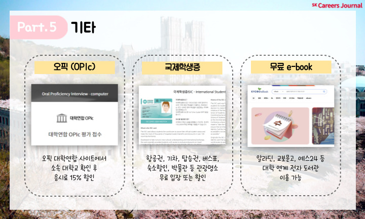 취업을 위해서 공인영어성적은 필수인데요. 다양한 영어 자격증 중에서 오픽은 대학생 할인 혜택이 있다고 합니다. 대학연합 오픽 홈페이지에서 제휴가 되어있는 학교라면 오픽 응시료를 15% 할인 받을 수 있습니다. 국제 학생증은 세계 어디서나 학생임을 증명할 수 있는 신분증인데요. www.isic.co.kr 사이트에서 발급받은 후 항공권, 기차, 탑승권, 버스표, 숙소할인, 박물관, 유적지 등 관광 명소를 무료로 입장하거나 할인 받을 수 있으며 일반 사설 업체에서도 다양한 할인 혜택을 제공하고 있습니다. 또한 학교가 알라딘, 교보문고, 예스 24등의 도서관과 제휴가 되어 있다면 무료로 e-book을 사용할 수 있는데요. 대학생을 대상으로 무료로 e-book을 제공하여 언제 어디서든 책을 볼 수 있습니다.